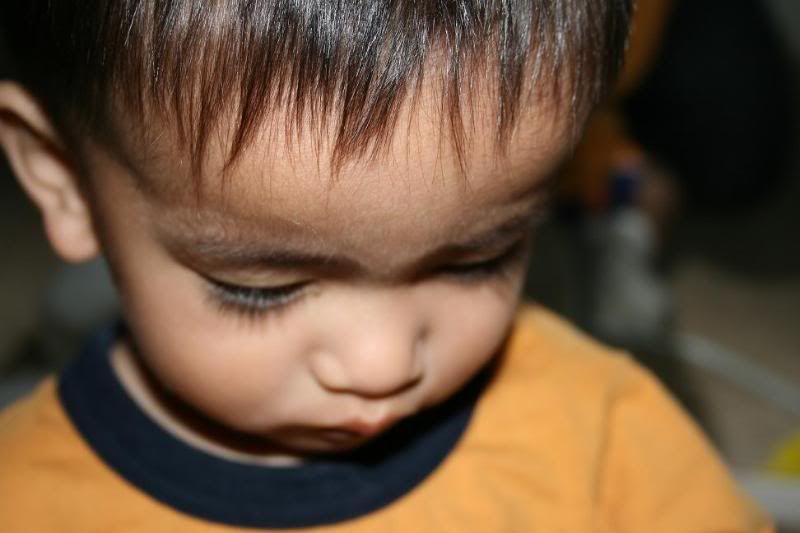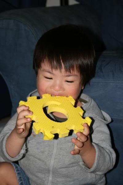 calebs spring pictures are tomorrow. im suppose to dress him up in spring colors. im excited when its picture day. the only thing that worries me is if hes gonna cooperate and smile! ha. caleb has these little toys is carries with him everywhere...they feel like foam so its soft and theyre shaped like puzzle pieces. i watch him everyday when he plays with them and think to myself, wow hes so smart. he entertains himself with these things. he picks up about 10 of them at the most. if hes carrying all 10 and 2 accidently fall out of his hands, he will go back and pick up the two with the 8 still wrapped under his other arm. its pretty funny. he brings to the living room and throws ALL of them on the couch. once he see that every single one is on the couch he will then go on the couch, sit down grab all of them again and then throw it on the floor. he'll smile, laugh, bounce up and down. and then...hell get off the couch, pick them up off the floor and put it back on the couch. hell do this twice and then bring all of them to his room. hes got patience and wisdom. he has downsyndrome and a case of autism but you know, hes a smart boy.